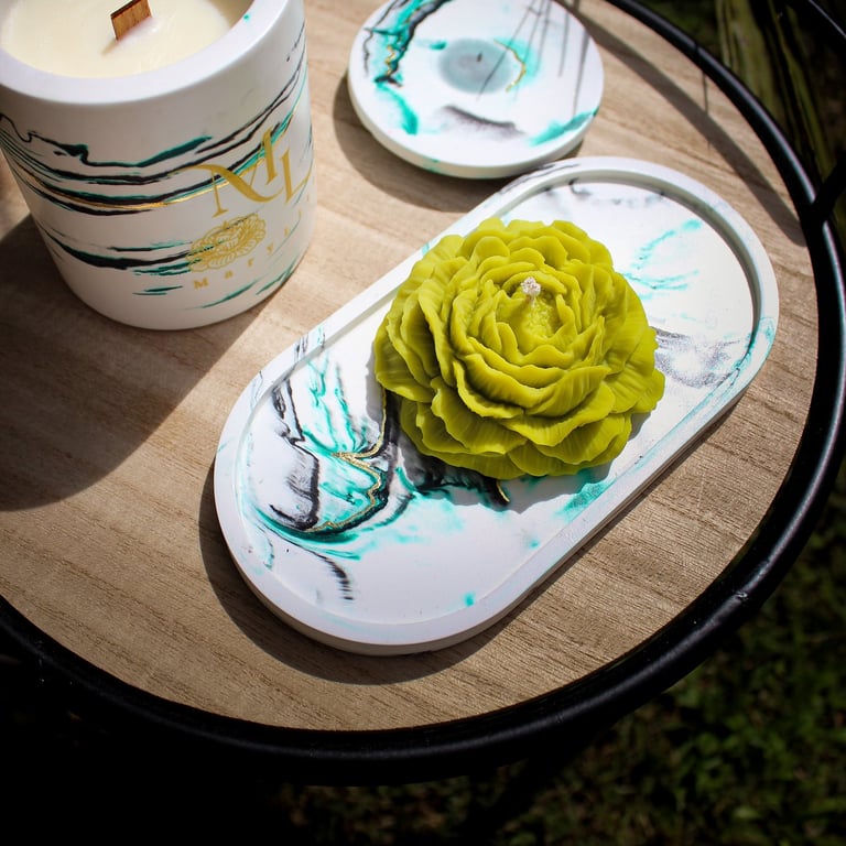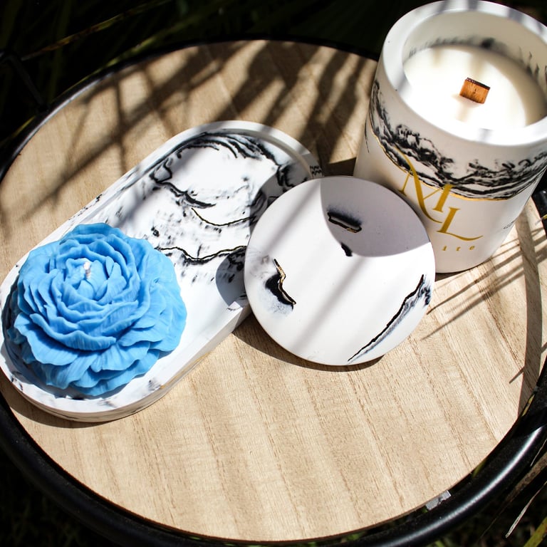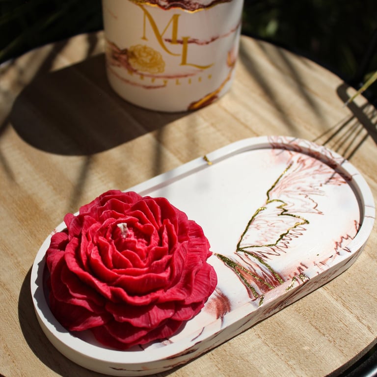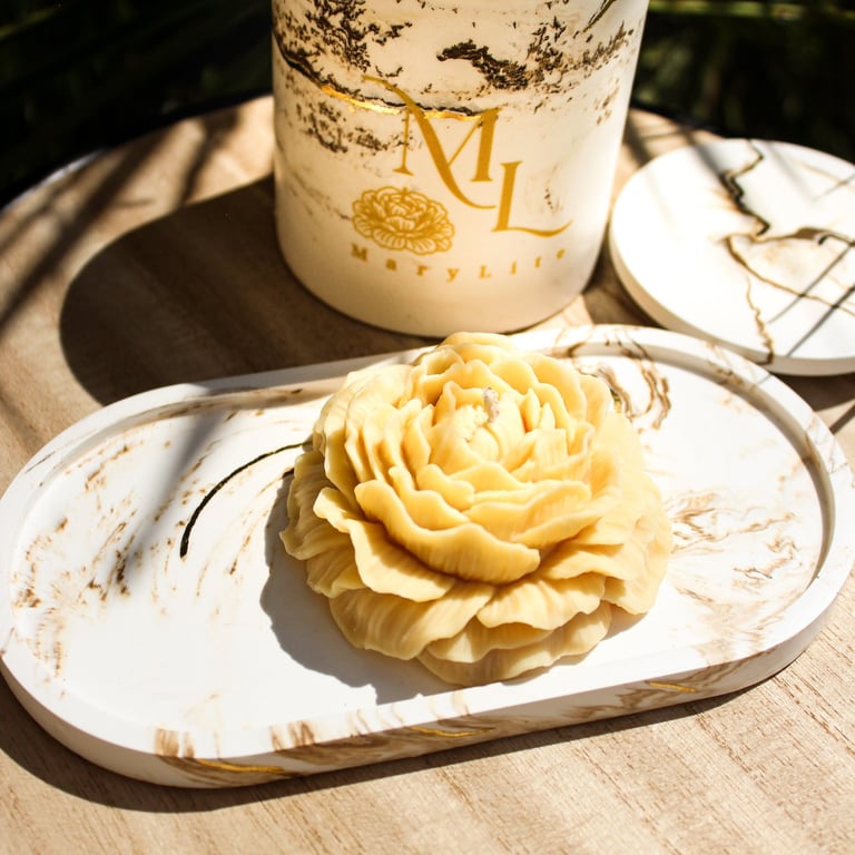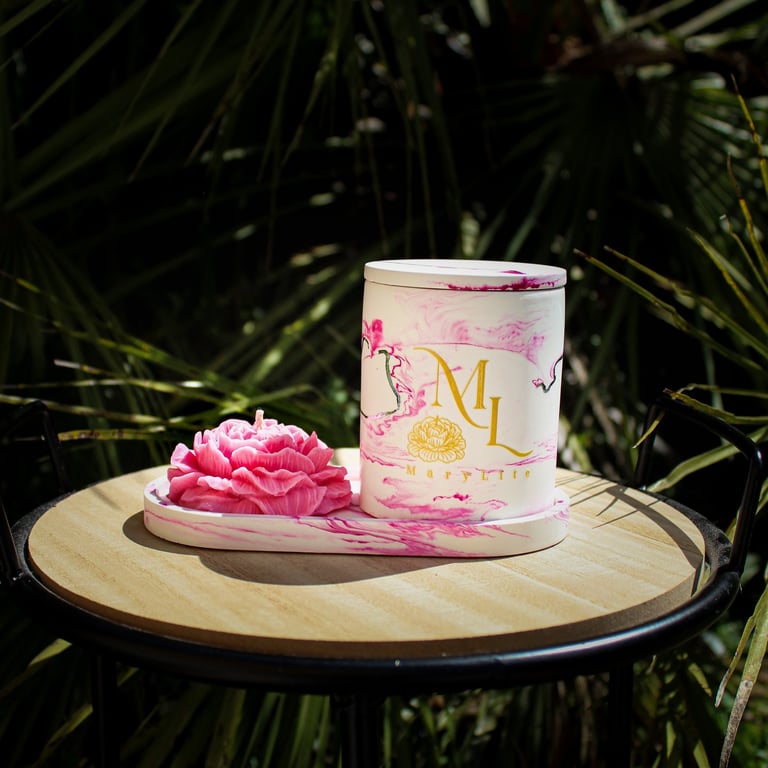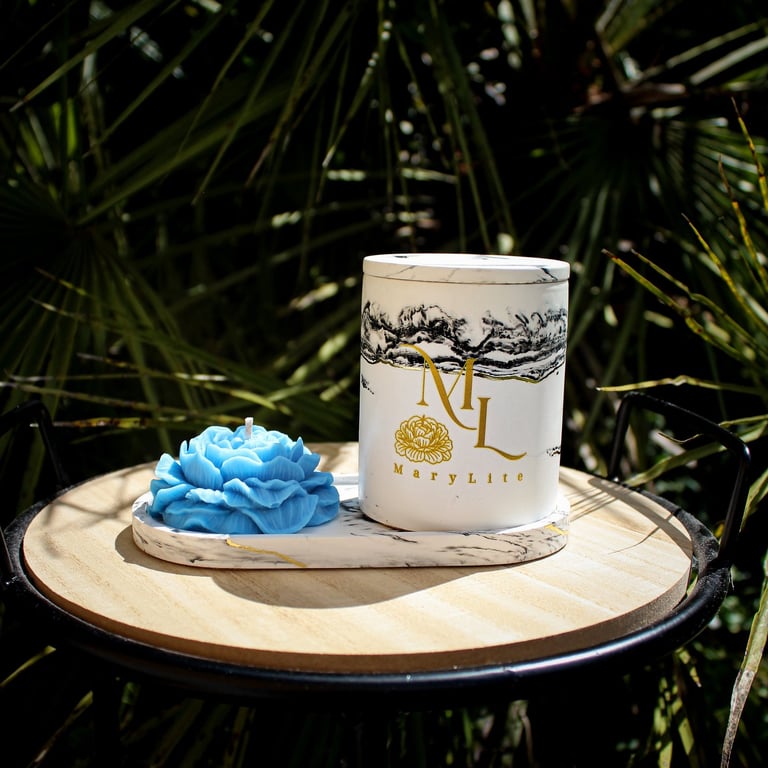 Dieses luxuriöse Set enthält zwei Kerzen mit passender Unterlage: